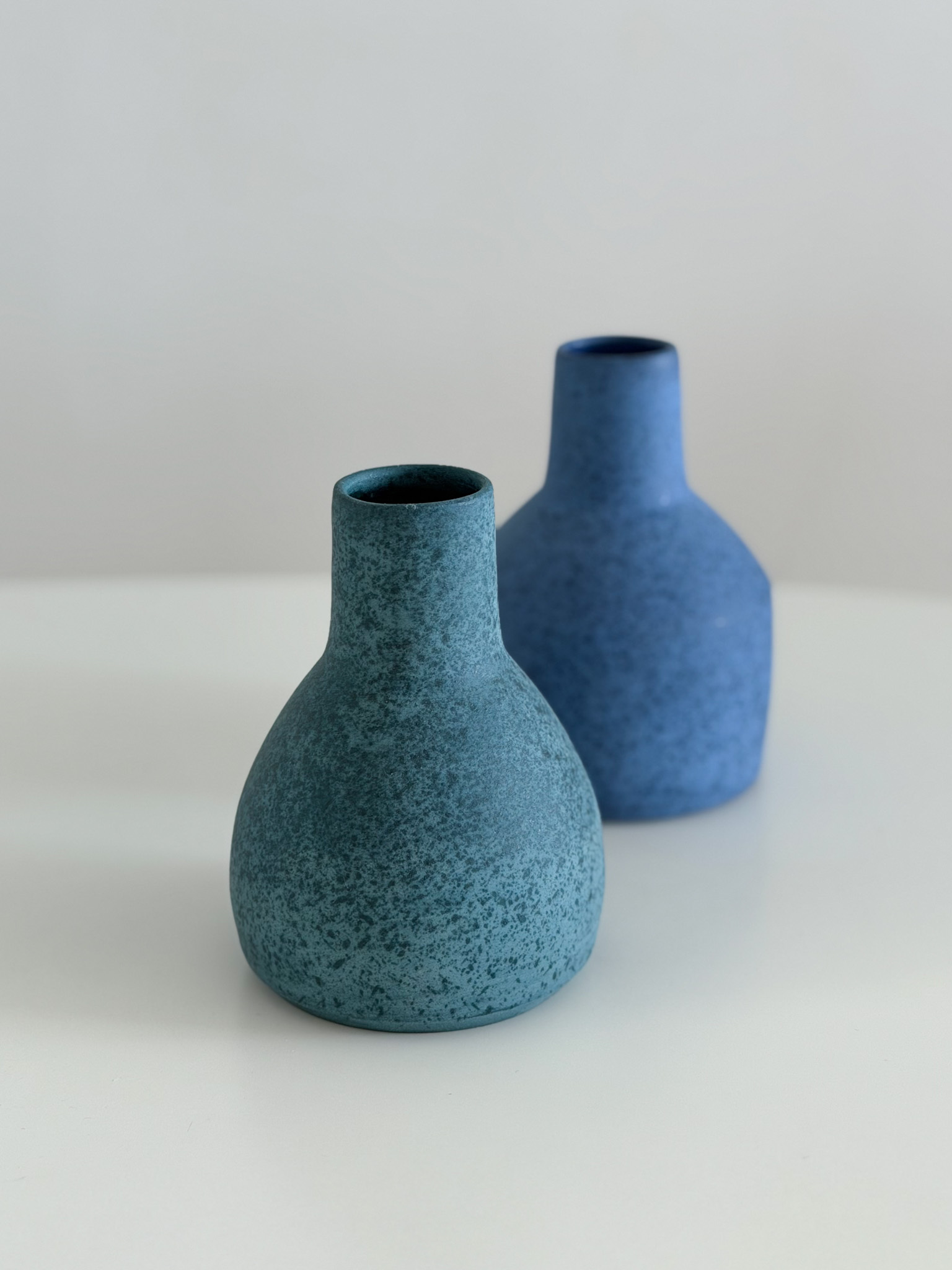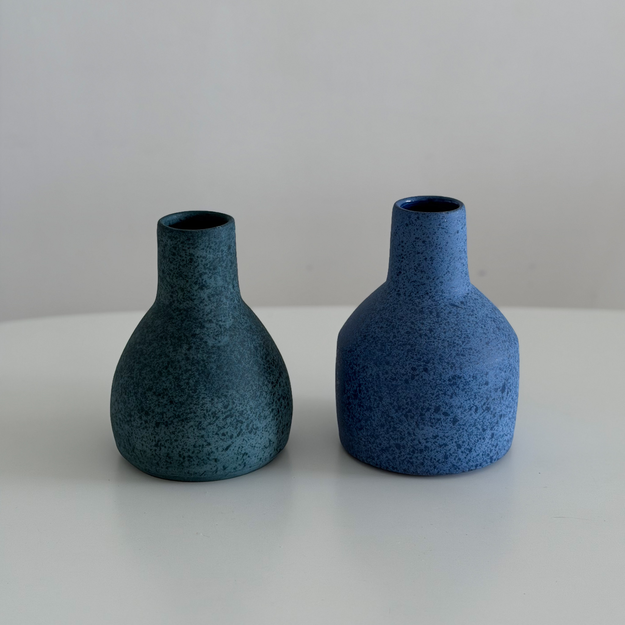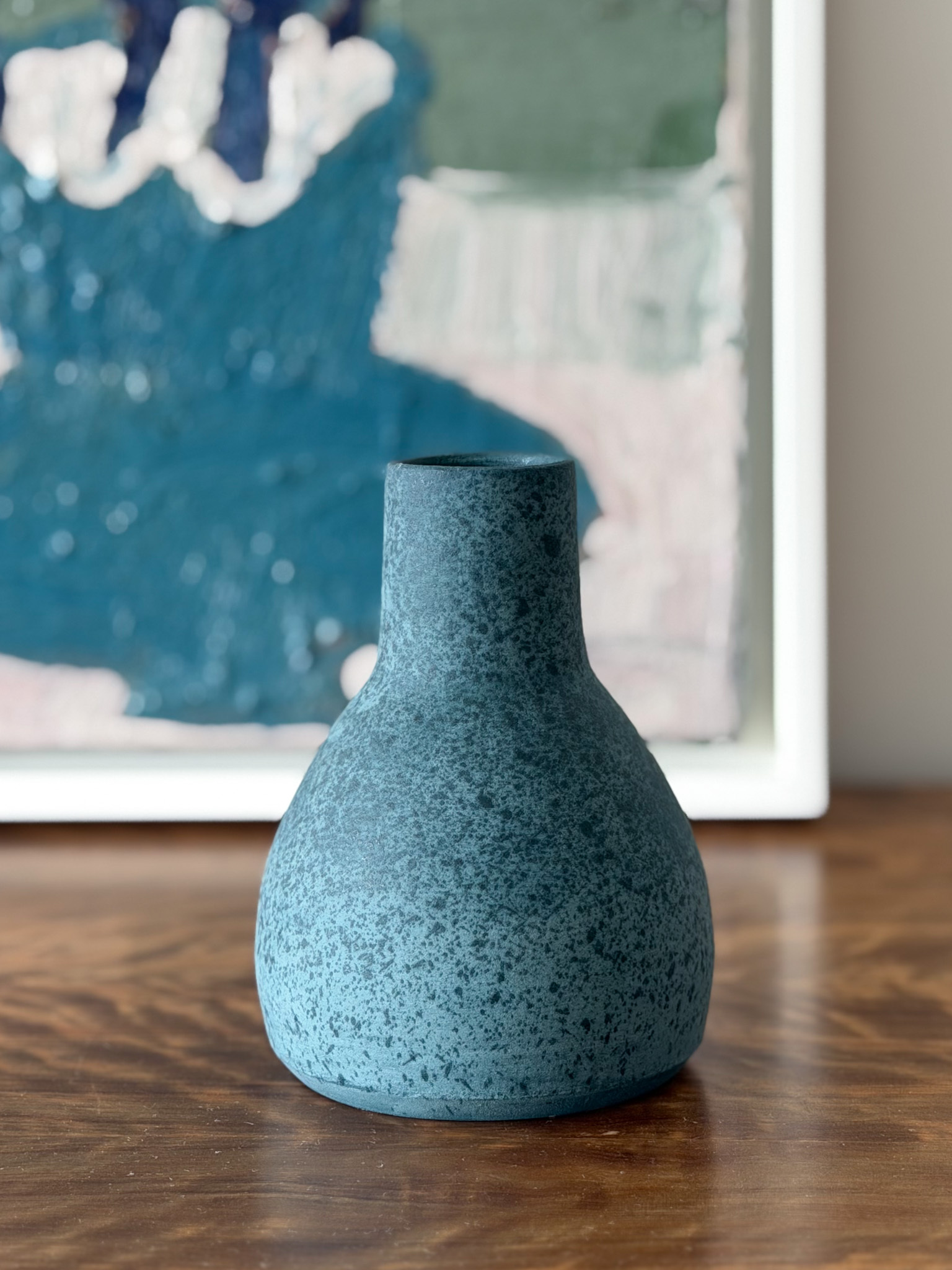 The vase features a texture reminiscent of the moon’s surface—raw, tactile, and quietly evocative. Its color rests somewhere between green and blue, in that subtle space that feels like it exists in between defined boundaries. This restrained yet intriguing palette, combined with its lunar-like texture, captivates collectors and invites them to linger in the beauty of the undefined.